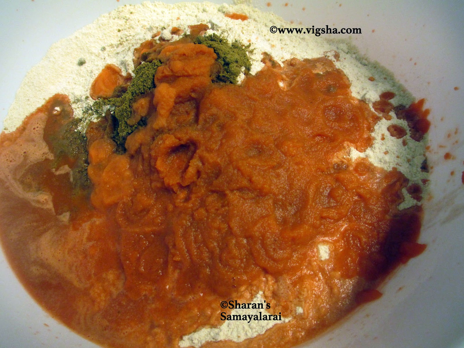 2). In a mixing bowl, mix wheat flour, sooji, salt and cumin powder. Then add the carrot paste and knead. Sprinkle milk or water and make a smooth dough. Add a tsp of oil at the end, cover and allow it to rest for 30 minutes.